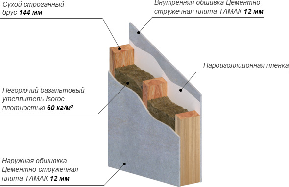 В стеновых панелях из негорючей базальтовой минераловатной плиты ISOROC, он обладает необходимой плотностью (60 кг/м3) и жесткостью, исключающие его осаживание.
