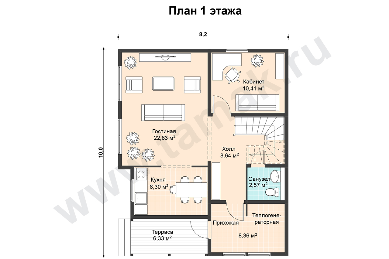 Планировка дома открытая, что создается применением больших проемов между гостиной, кухней и холлом. Но в то же время на первом этаже есть уединенный большой кабинет. Также на первом этаже предусмотрен санузел, теплогенераторная и прихожая с выходом на террасу. На втором этаже расположены три спальни, одна из которых имеет выход на лоджию, холл, кладовая и большая ванная комната с санузлом.