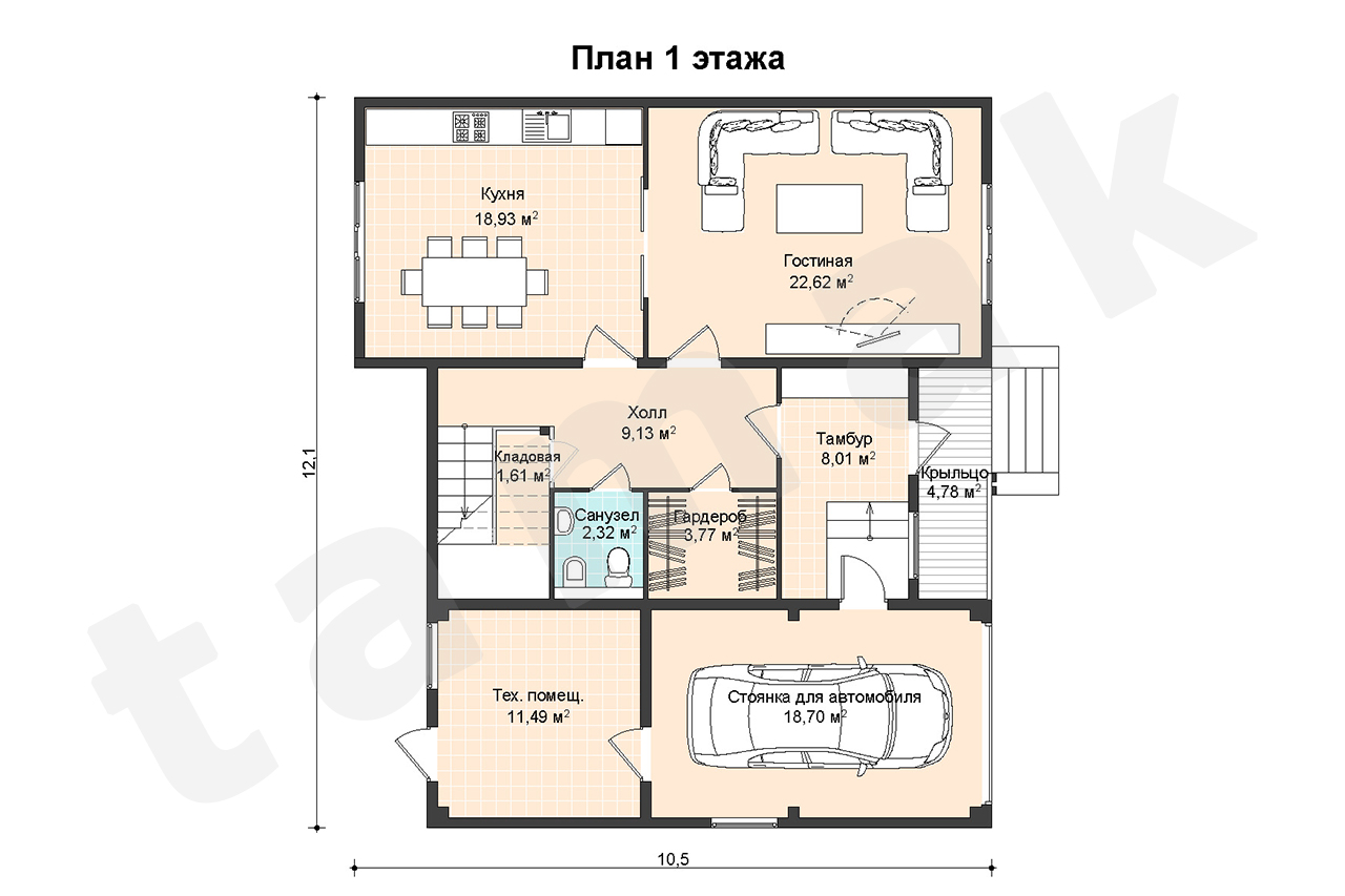 Планировка дома продумана до мелочей. На первом этаже размещается гостиная, кухня, кладовая, гардеробная комната, холл, тамбур. Кухня и гостиная являются отдельными помещениями, но соединяются порталом с раздвижными дверями, который при желании объединяет оба помещения модифицируя первый этаж в студию. Все пространство под лестницей используется в качестве кладовой практично используя каждый квадратный метр. К дому примыкает гараж, который имеет дополнительный вход непосредственно в дом через тамбур и техническое помещение, которое соединяется с гаражом и имеет отдельный дополнительный вход с тыльной стороны дома. На втором этаже расположились три спальни, одна из которых имеет выход на уютный балкон, большой санузел и холл. Над гаражом расположен просторный кабинет, который может быть использован как библиотека. Большие панорамные окна наполнят дом светом и солнечным теплом.