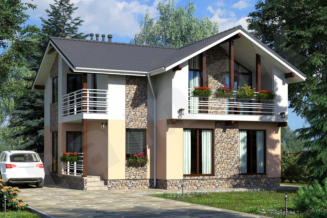 Коттедж выполнен по каркасно-панельной технологии из крупноразмерных панелей по австрийской системе VARIOMAK. Архитектура дома реализована в австрийском стиле с элементами современного дизайна. Выносной балкон, оштукатуренные фасады со вставками из натурального камня создают узнаваемый образ австрийского шале. Коттедж выглядит внушительным и в то же время «легким» за счет остекления и светлых фасадов.