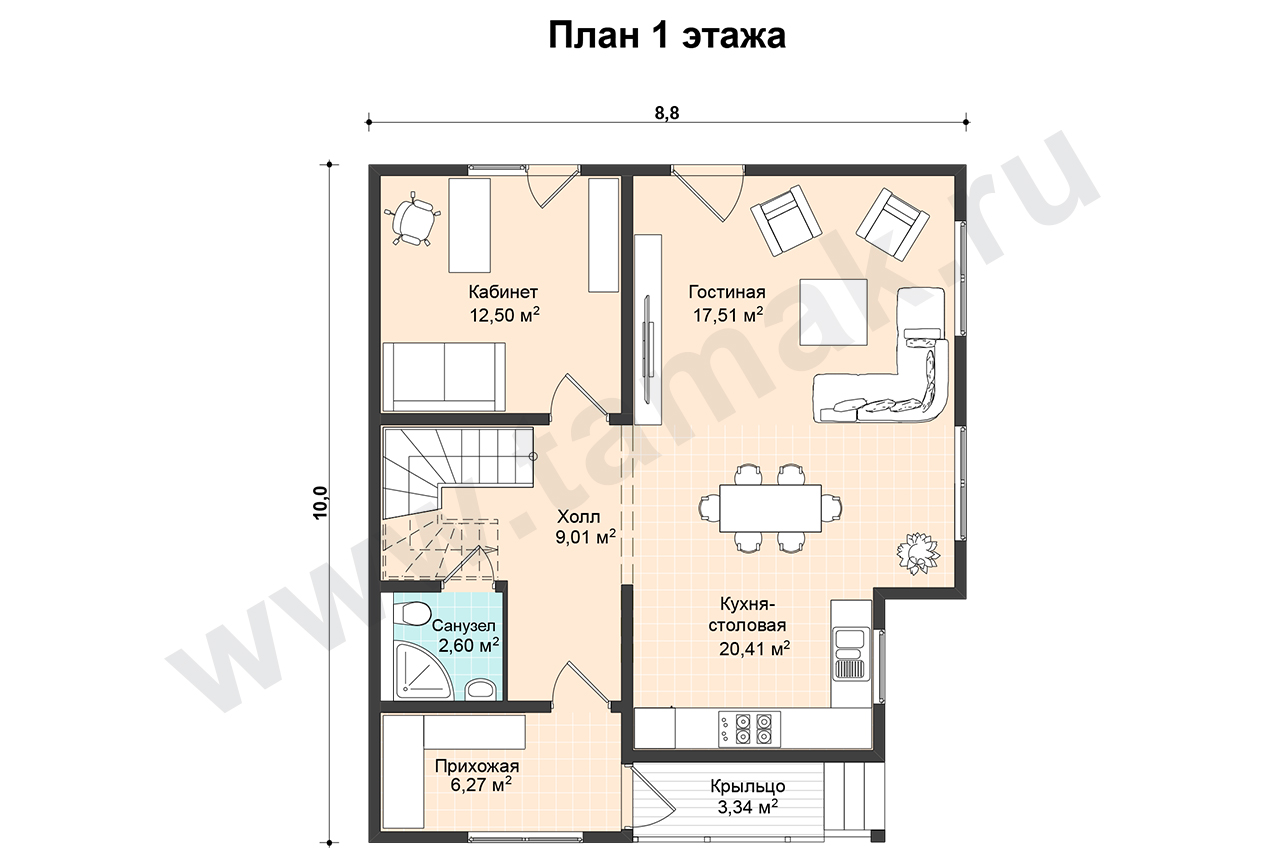 Данный проект очень практичный, но в то же время современный и открытый для комфортного проживания 3-4 человек.