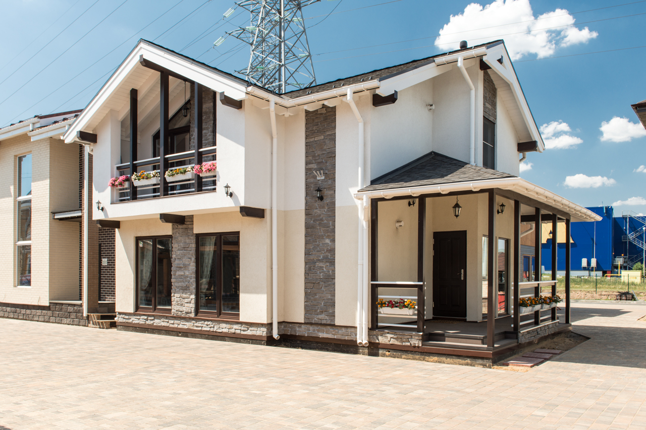 Коттедж выполнен по каркасно-панельной технологии из крупноразмерных панелей по австрийской системе VARIOMAK. Архитектура дома  реализована в австрийском стиле с элементами современного дизайна. Выносной балкон, оштукатуренные фасады со вставками из натурального камня создают узнаваемый образ австрийского шале. Коттедж выглядит внушительным и в то же время «легким» за счет остекления и светлых фасадов.