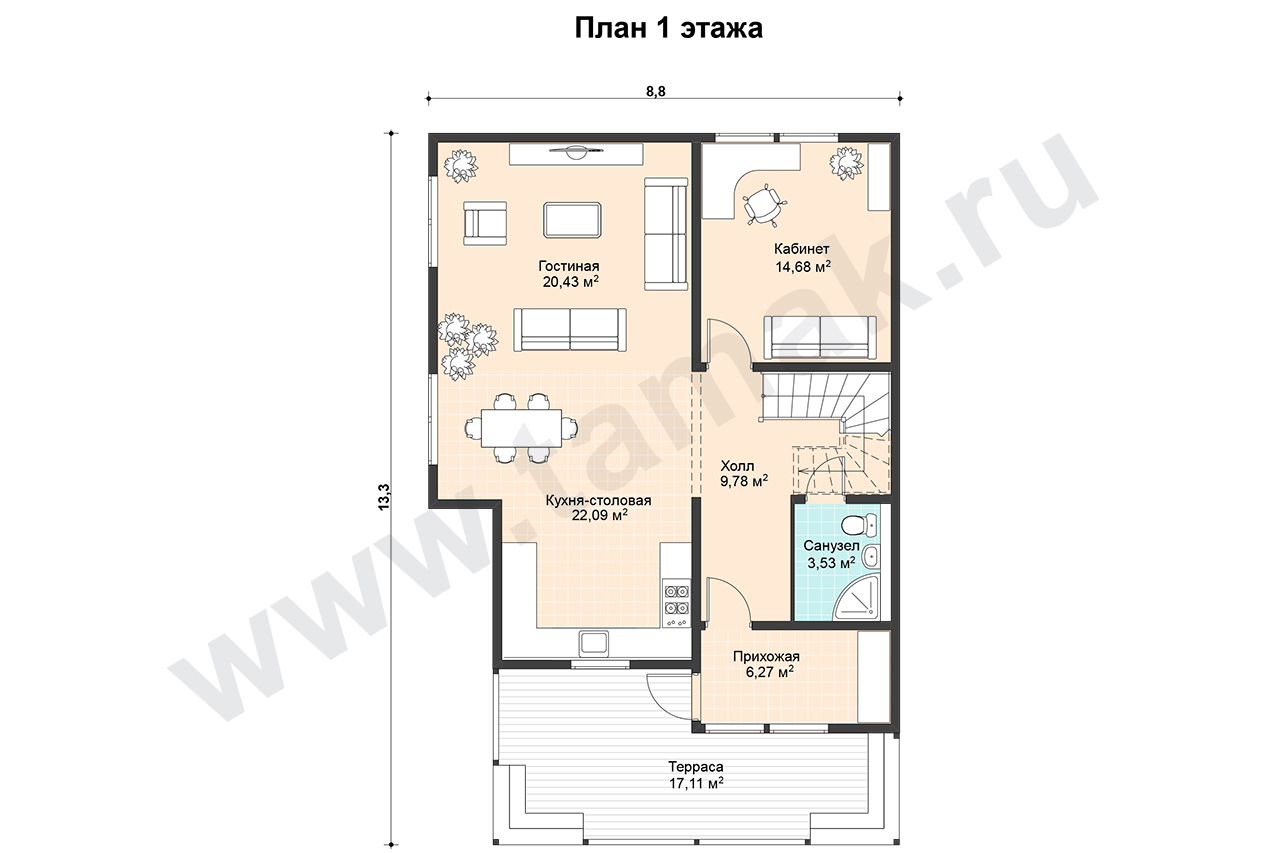 Данный проект очень практичный, но в то же время современный и открытый для комфортного проживания 4-5 человек.