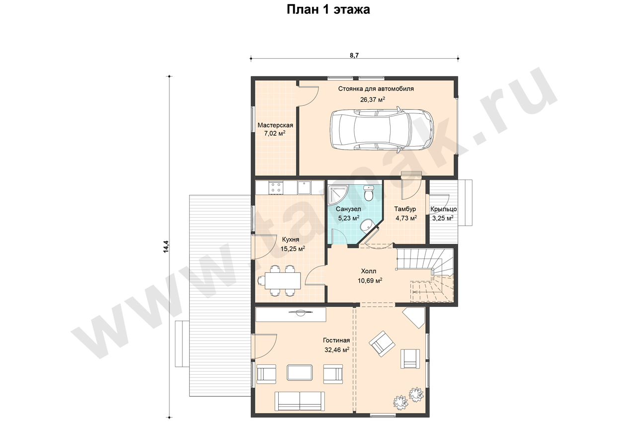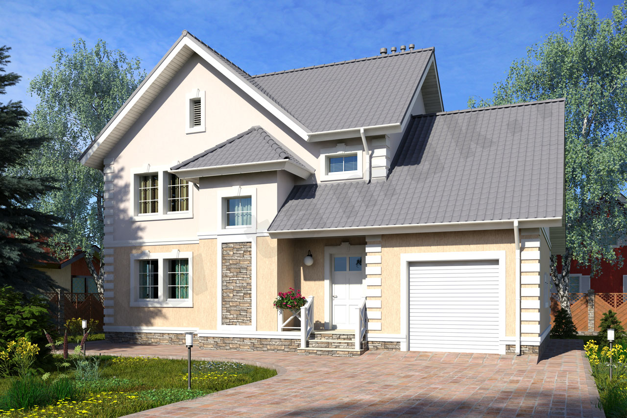 Проект просторного двухэтажного дома с многоскатной кровлей, гаражом, мастерской и большой кладовой очень популярен. Традиционный архитектурный стиль и современный интерьер хорошо дополняют друг друга. Коттедж выглядит внушительным и в то же время «легким» за счет светлых фасадов. Особенно порадует мужчин наличие мастерской в гараже, а женщин - просторная кладовая на втором этаже дома. В таком доме себя прекрасно будут чувствовать все члены большой семьи.